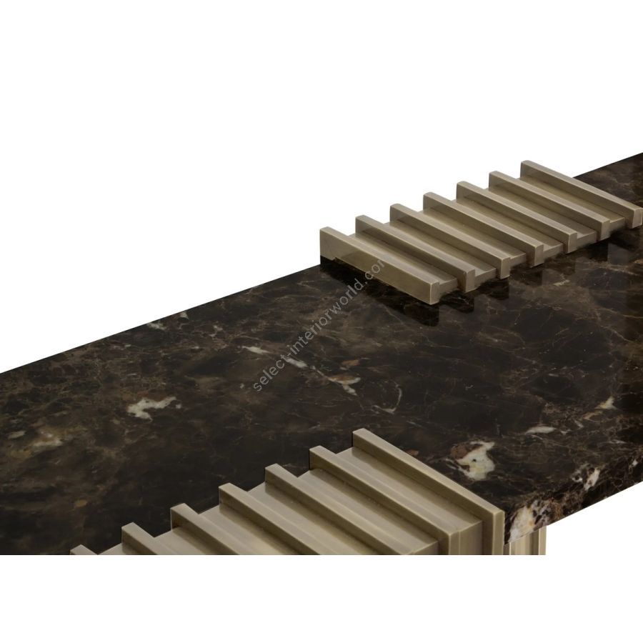 With its conspicuous and elegant lines, the Vertigo Console proves to be an impressive piece of modern luxury. Its striking and dynamic pose adds a touch of glamour to both modern and classic entryways or hallways. The shimmering line in gold-plated brass seamlessly merges with any living room decor, enhanced by the Nero Marquina marble finish. This fascinating and exclusive console table exudes luxury and cohesive style.