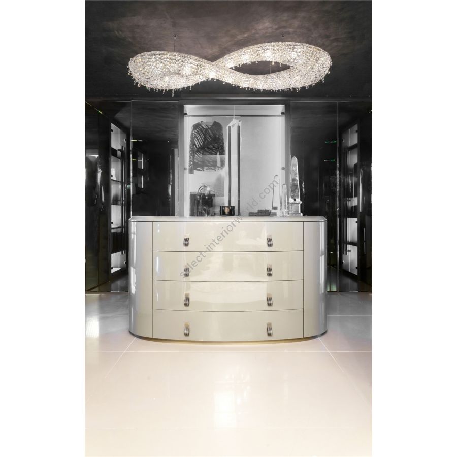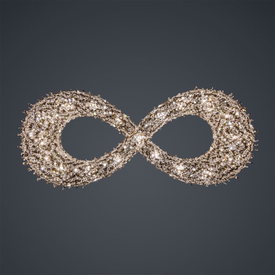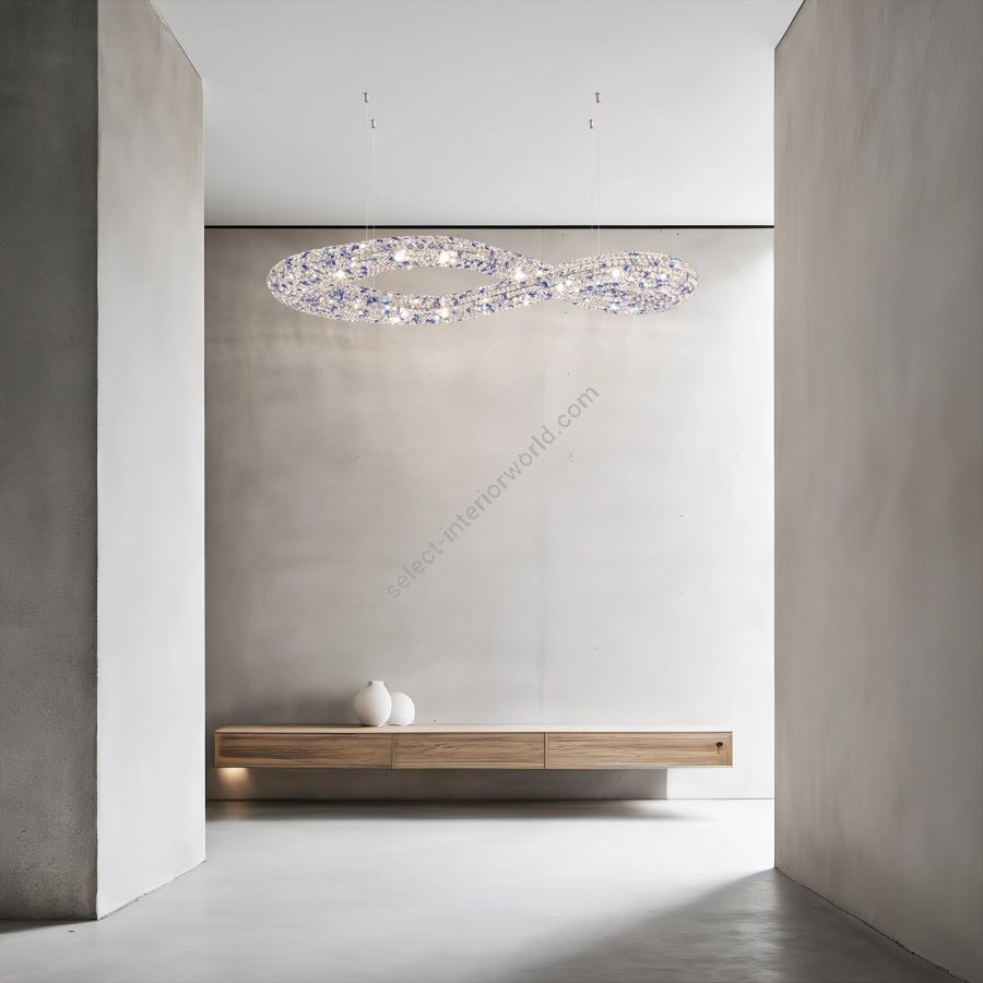 The Infinity crystal chandelier awakens the power of eternity with its never-ending loops. This contemporary chandelier symbolizes empowerment and everlasting beauty. It offers a playful and dynamic illumination concept to any setting. The shape of this exclusive pendant lamp will bring an artistic touch to your interior design project.