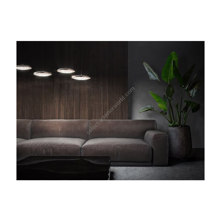 The name Origo means “origin” and alludes to the infinite light at the birth of the universe, bringing a sense of cosmic depth to its perfectly circular form. A fusion of luxury and minimalist aesthetics, the Origo crystal chandelier embodies the essence of modern elegance. This handmade crystal chandelier is crafted from premium-quality crystal and offered in a variety of finishes. It can be flexibly integrated into complex, high-end interiors, with bespoke options available for tailored design concepts. Its adaptable structure allows for both horizontal and vertical compositions. Horizontal arrangements work beautifully above kitchen counters, dining tables, or workspaces, while vertical installations are ideal for staircases or atriums with high ceilings. Whether displayed as a single statement crystal lamp or arranged in groupings, the Origo crystal chandelier adds a sophisticated visual presence to a wide range of architectural settings. Recommended to be installed in clusters of varied sizes.