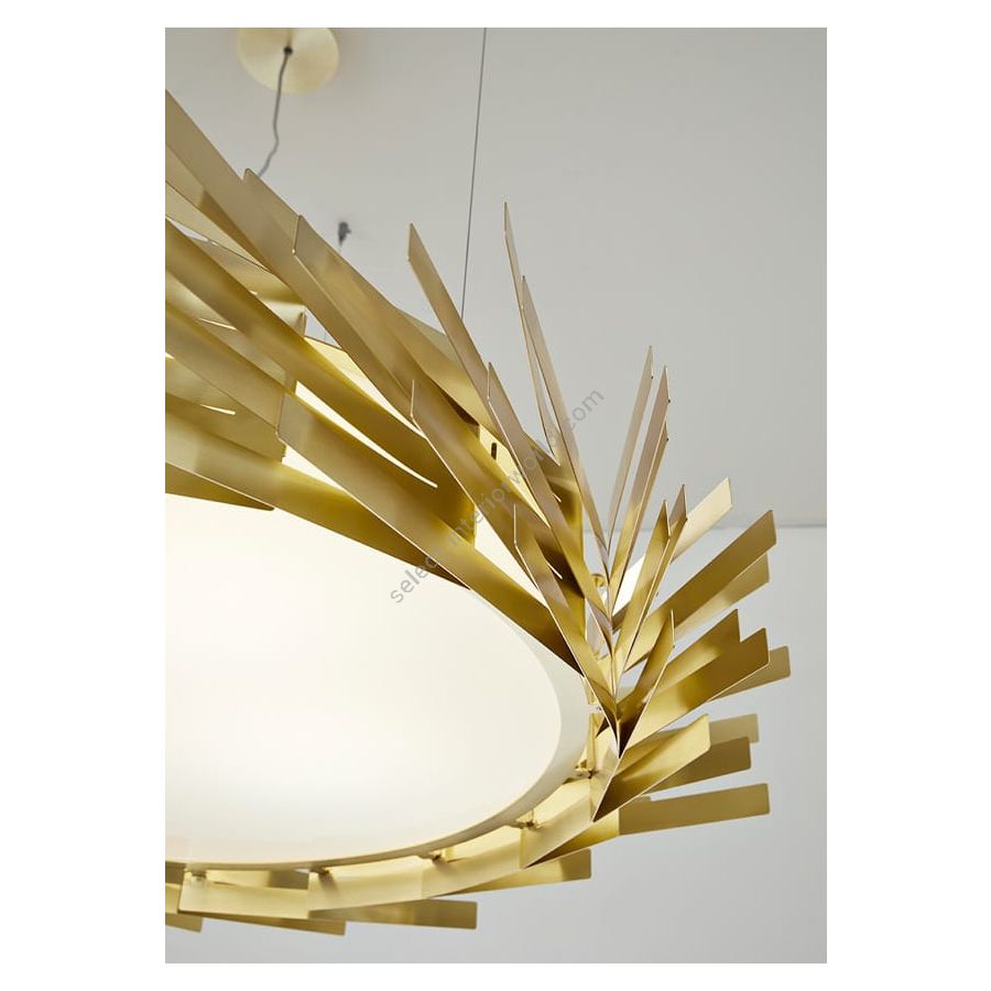 The neoclassical and empire style inspires this lamp that transforms the decorative crystal elements of geometric and elongated shape into a repeated and circular motif installed horizontally and in metal, enriching Jack with new plays of light. Its kinetic structure allows moving some of its parts, thus changing its diameter and giving it a continuously evolving design.