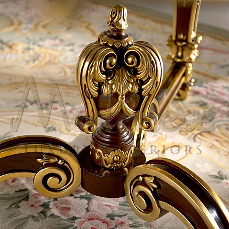A decorative furniture item that will make the difference, this round center table is not for everyone. Green beveled onyx top, empire-style legs and walnut finish with gold leaf applications all over the carvings. So many secret details you can spend a night counting them. Modenese Furniture can also offer matching armchairs, sofas and tables, in order to create the perfect ambient for your villa to shine.