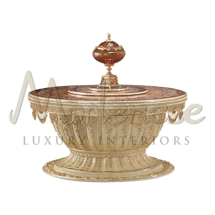 Impress your guests with this ravishing round table featuring an up-down lifting mechanism by Modenese Interiors. Ideal for ceremonies and parties, this piece of furniture is undoubtedly unique and ostentative. Besides the wonders of the mechanism, the table surfaces are decorated with a complex inlaid pattern and the structure is realized in solid wood.