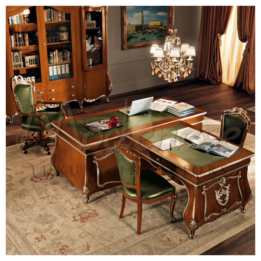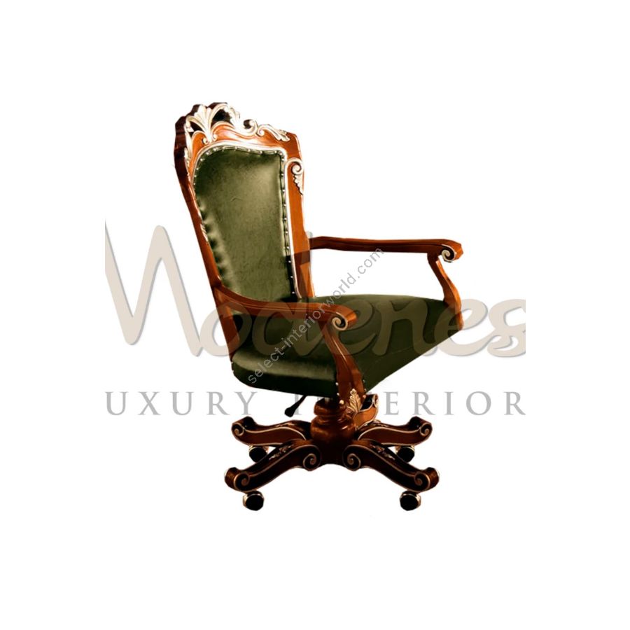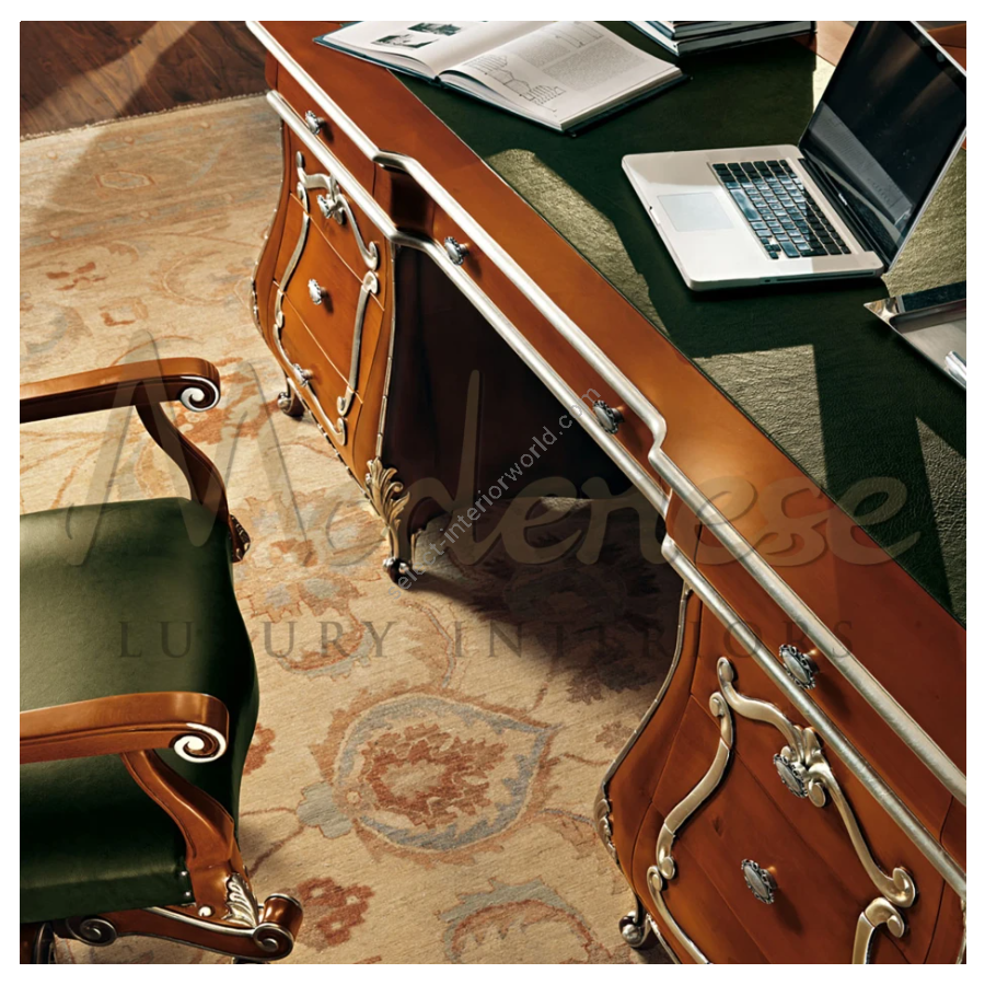 This Modenese Furniture swivel armchair has been specifically conceived for executive offices. This product, composed by a solid wooden structure in patinated cherry wood finishing, decorated with silver leaf details, and upholstered with genuine leather represents the perfect solution for top managers' premium offices.