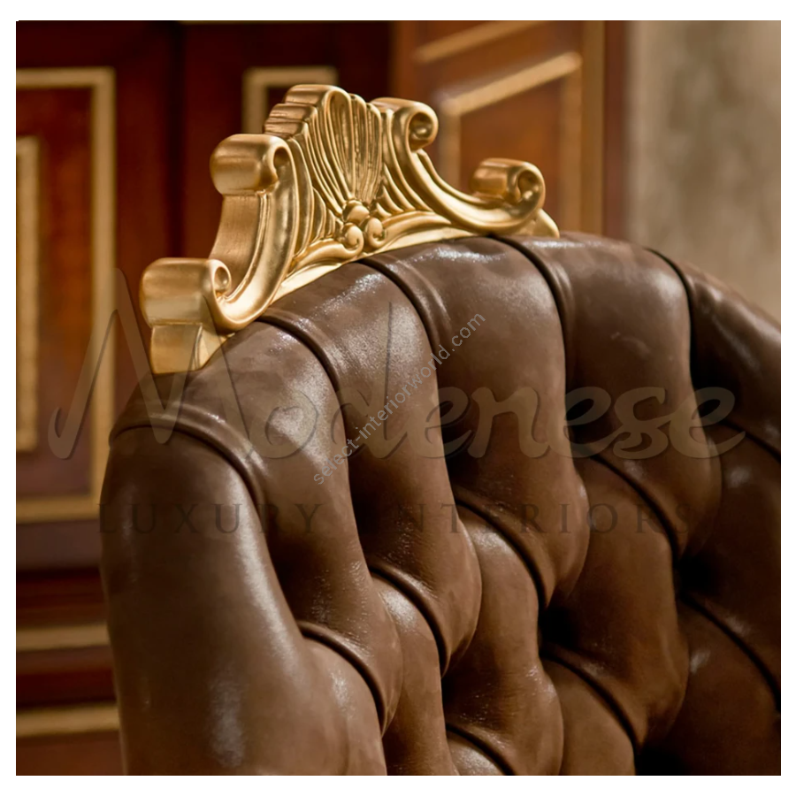 A great functionality that comes with sophistication is the result of this leather swivel armchair. The craftsman work is highlighted here by patinated gold leaf details with whole seating has covered with leather and finished with capitonné stitch. The colour choice can be altered upon requested.