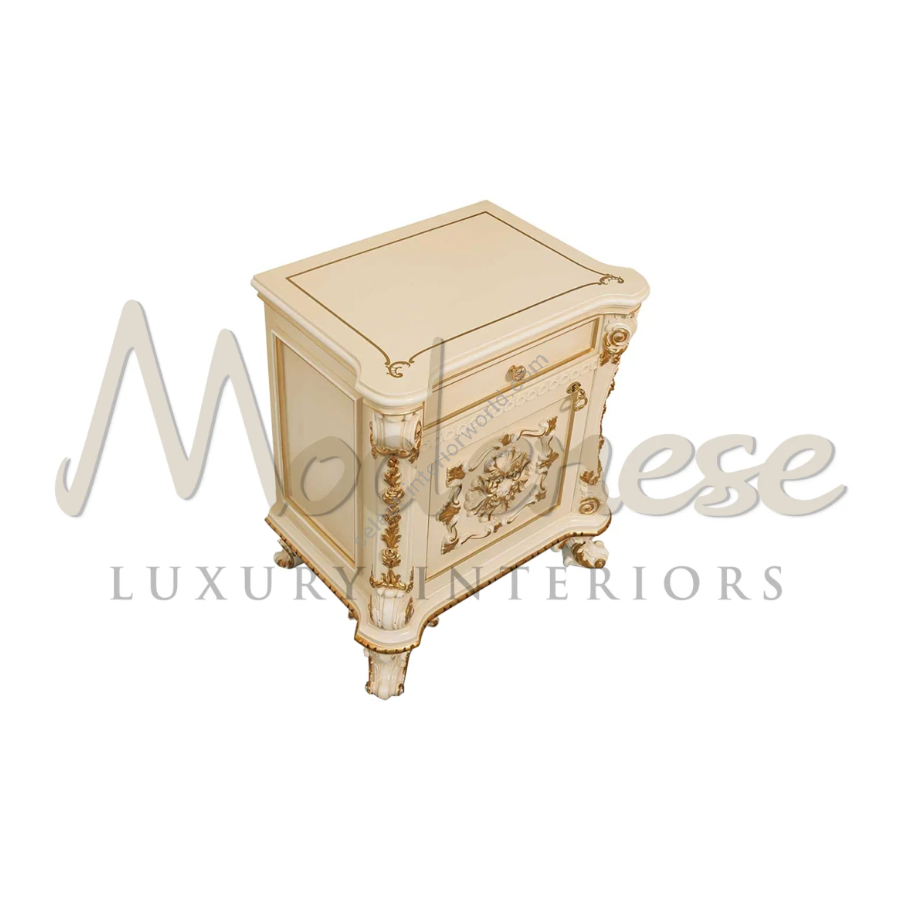 Modenese Furniture producer is proud to promote this brand new luxury night stand. This figured night stand features a lacquered ivory finish, baroque legs and carvings carefully hand-decorated with gold leaf. its elegant shape and the baroque touch make it a great candidate to fully furnish your bedroom with paired bed, wardrobe, vanity units and armchair from Modenese Furniture, that can take over your residential design project from A to Z.