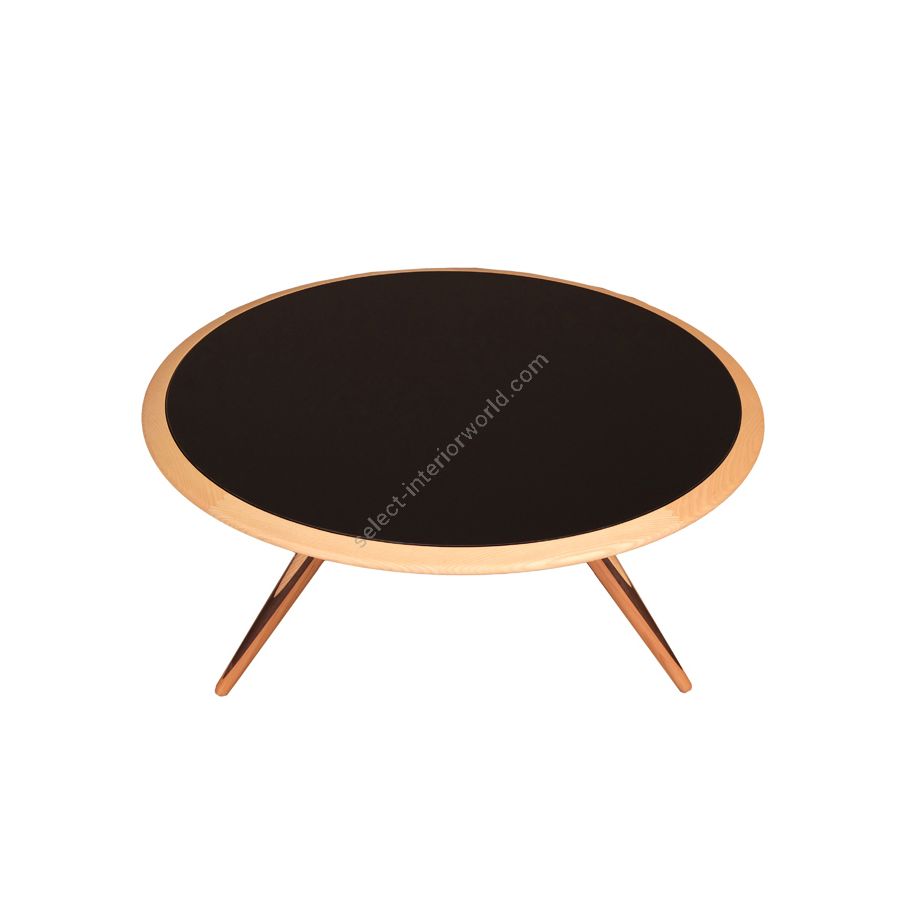 Coffee table with round ash wood top and glass insert. Turned legs in the shape of biliard cues made of cherry, wengè and maple. Customizable top finish, with central glass insert upon request.