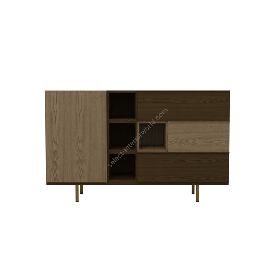Ash wood sideboard made up of open modules, modules with door and modules with drawer, internal glass shelves, base with adjustable brass feet.