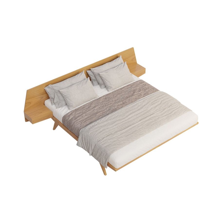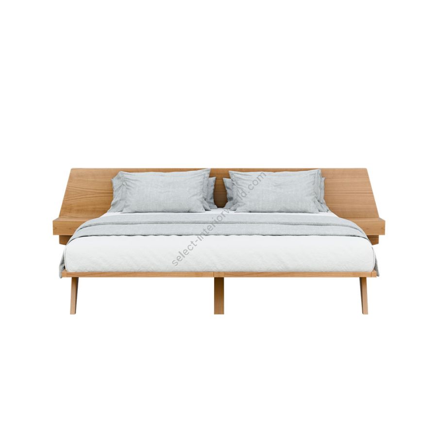 Bed with a solid cherry wood structure and headboard with integral bedside tables. Wooden slats mattress support.