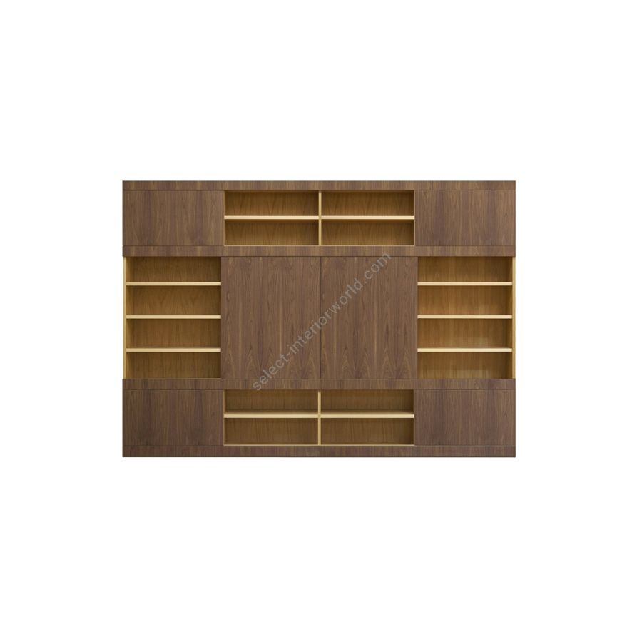 Proposal for a modular Mask bookcase. Internal 4-elements open structure made of cherry wood with adjustable shelves, 2 big sliding doors and 4 small sliding doors made of canaletto walnut wood. The Maschera system offers a wide range of proposals. Inspired by figurative themes of the tradition the system is designed for the needs of contemporary living. Its mutable character regarding colors and wood types makes the wall unit fit for any architectural ambience as furnishing protagonist or a neutral background.
