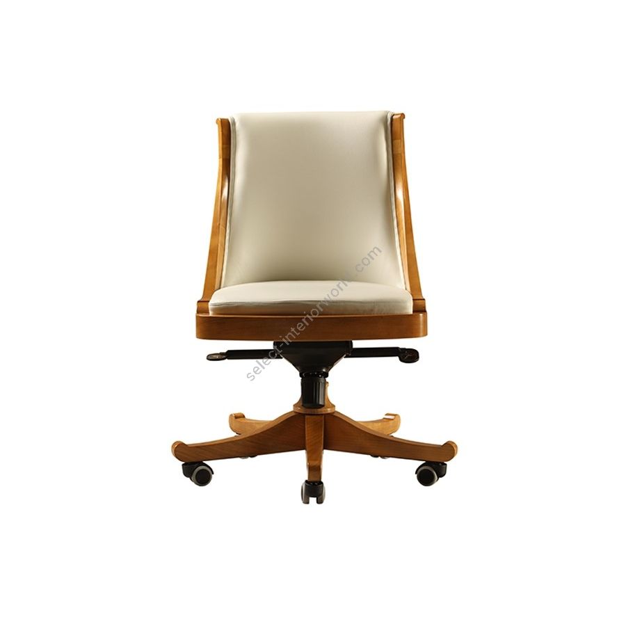 Swivel chair on wheels made of cherry wood, shock absorber adjustable in height and reclining. Upholstered seat and back. Upon request made of walnut wood.