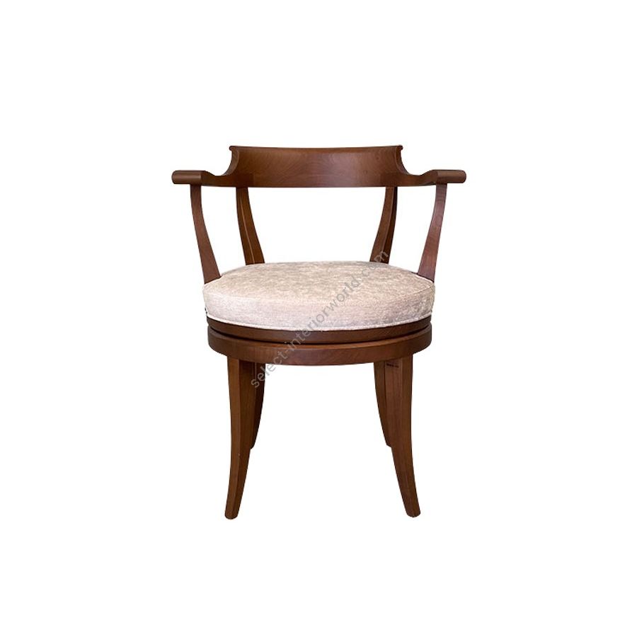 Armchair made of cherry wood with armrest and shaped backrest, swivel upholstered seat and saber legs.