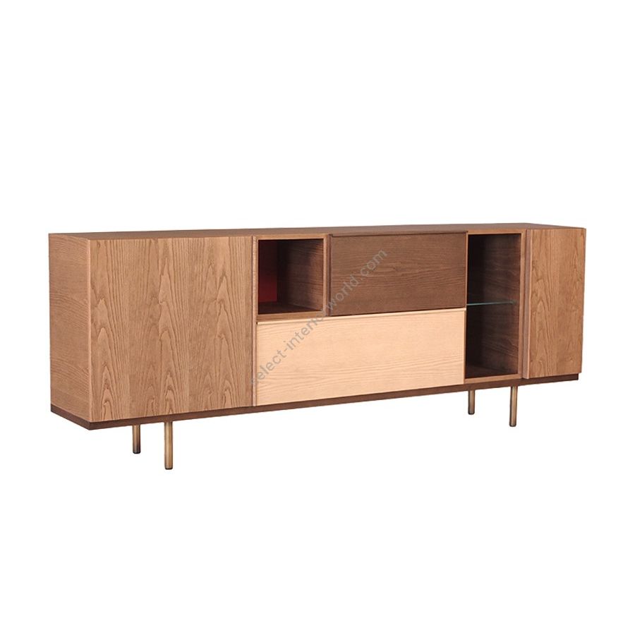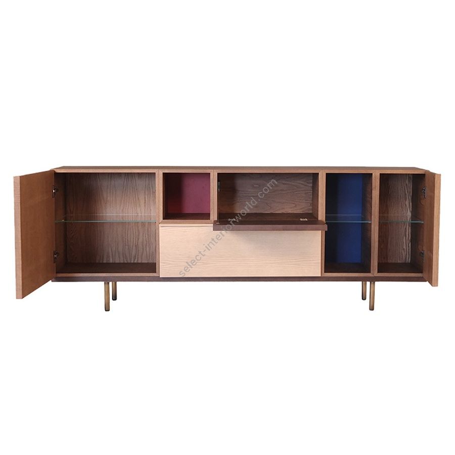 Sideboard in ash composed of 3 modules with doors, 1 module with drawer 2 open modules. Internal glass shelves. Base with adjustable brass feet.