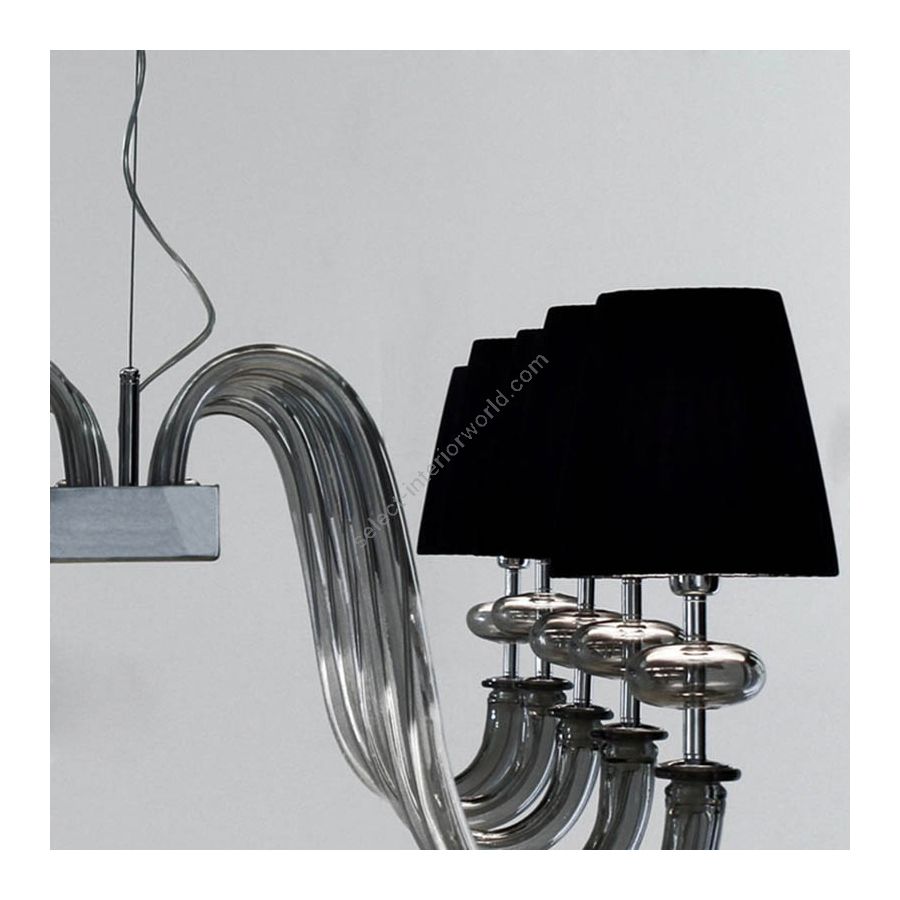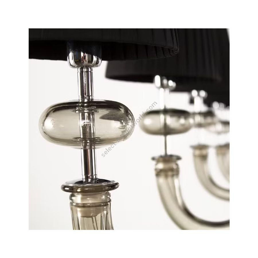 Contemporary Design 10 lights chandelier in Murano glass from the Contrappunto collection that draws inspiration from the classic chandeliers of the Venetian tradition. Traditional are the black pleated lampshades and the grey art glass arms. Unusual and modern is the assembly of these elements, mounted on a rectangular polished chrome frame.