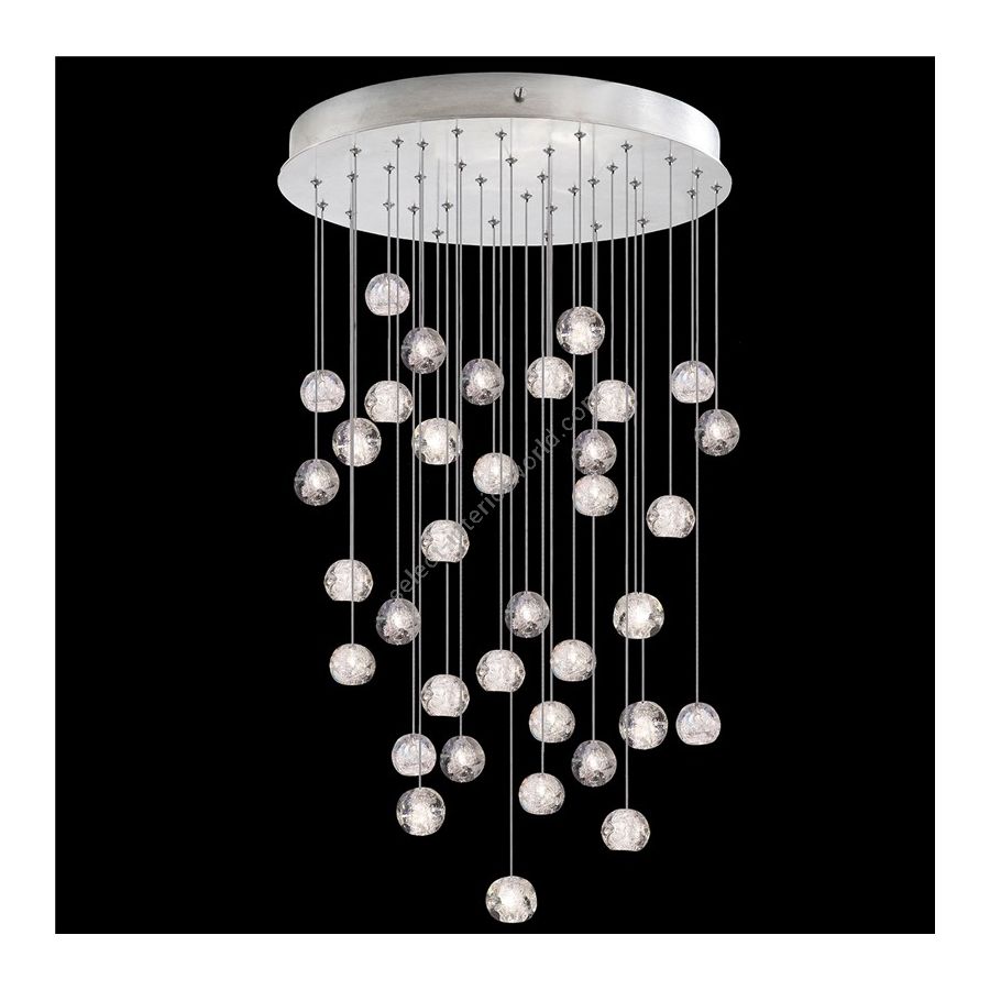 The Nebula creates the essence of cosmos through hand forming of optic impressions while infusing the crystal with the reflective quality dichroic glass. Each piece is as individual as the rainbows of light from the galaxies above. Silver leaf canopy. Also available in gold-toned silver leaf with choice of additional crystal glass options. For 220V, item is configured with halogen G4 bulb(s).