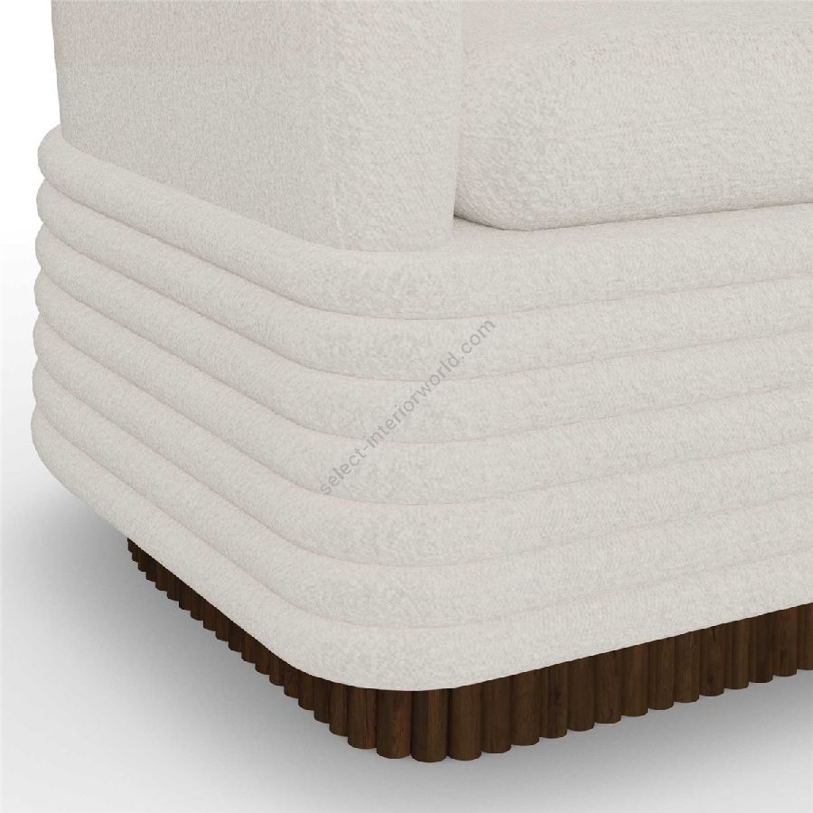 The armchair sits atop a ribbed walnut base, replacing the previous black timber design, bringing an added layer of warmth and natural beauty to the piece. The rich walnut grain and meticulously crafted ribbing provide a subtle yet striking textural contrast against the soft bouclé, enhancing the chair’s contemporary aesthetic while maintaining a timeless appeal.