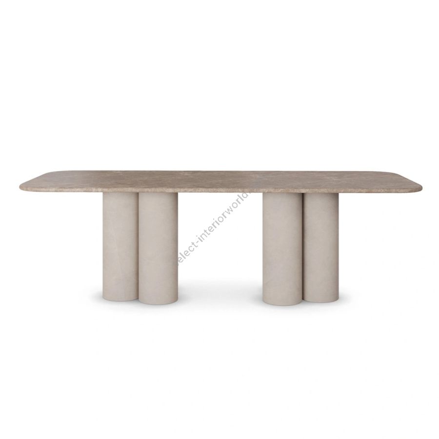 Supporting the marble top are cylindrical legs, also crafted from marble, providing a cohesive and sturdy base for the table. The bold, column-like legs not only offer stability but also contribute to the table’s architectural appeal, making it a statement piece in any dining room. The cylindrical shape of the legs complements the rounded edges of the tabletop, reinforcing the table’s overall sense of fluidity and elegance.