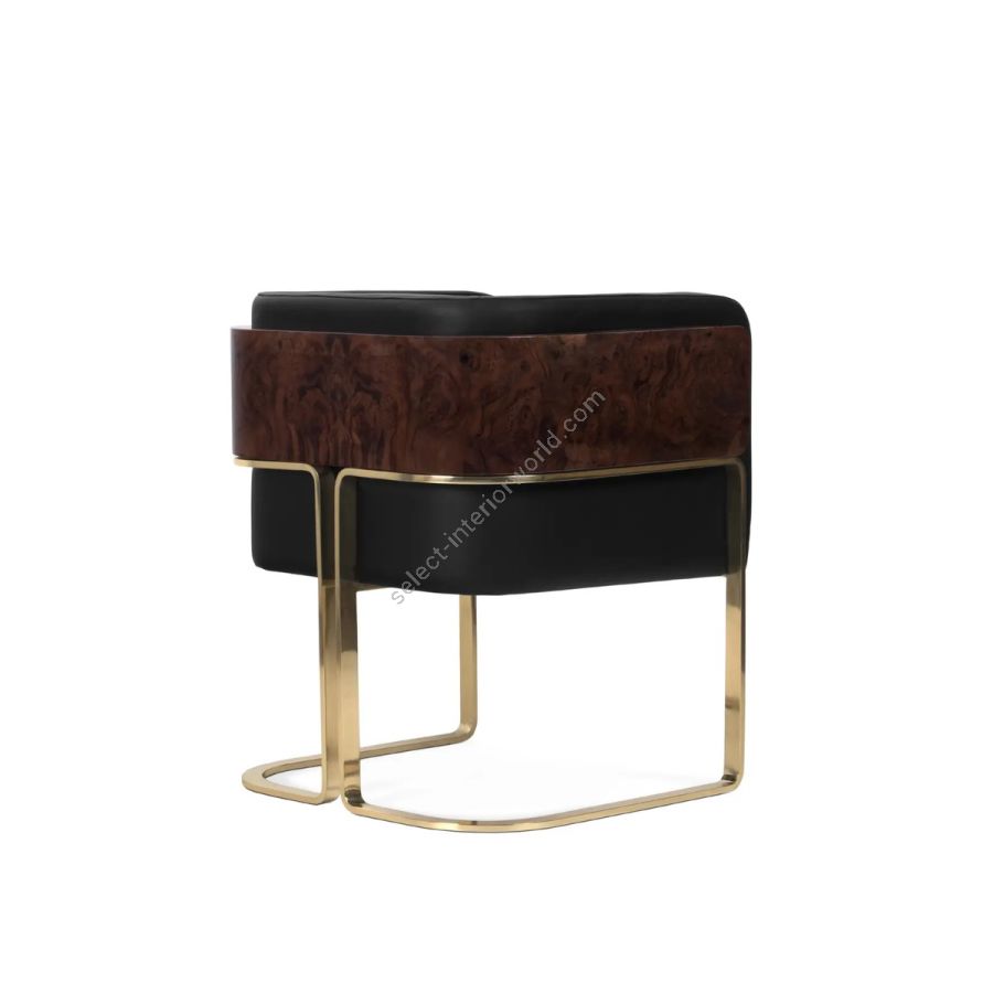 Featuring a uniquely shaped backrest, the Nura Dining Chair is the ultimate expression of cozy luxury. Shaped like a U, Nura is made of leather, brass, and wood and provides an embracing comfort only found in upholstery solutions with the same shape. Ideal for cozy yet glamorous dining rooms and restaurants.