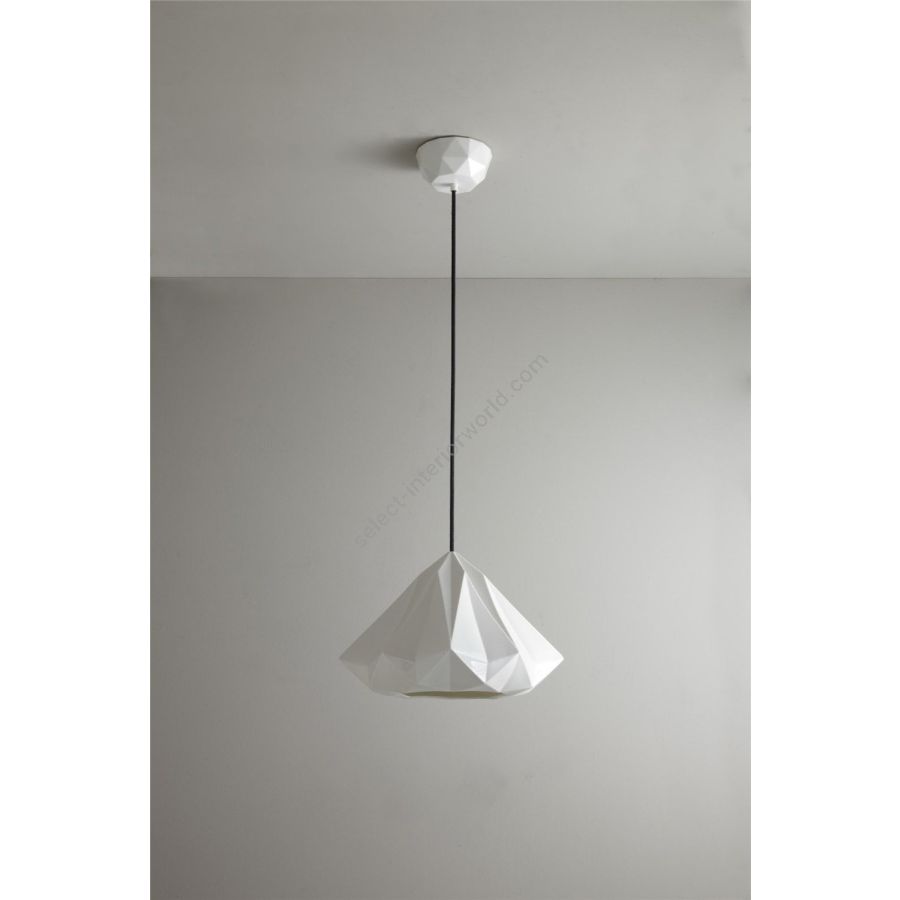 The Hatton 2 Pendant has a beautifully intricate bone china shade. Using a highly skilled process, we have been able to transform bone china into a multi-faceted, symmetrical, gem-like form. When switched 'off' the pendant has an angular sculptural beauty, and when 'on' it provides warm illumination with dramatic lines and shadows.