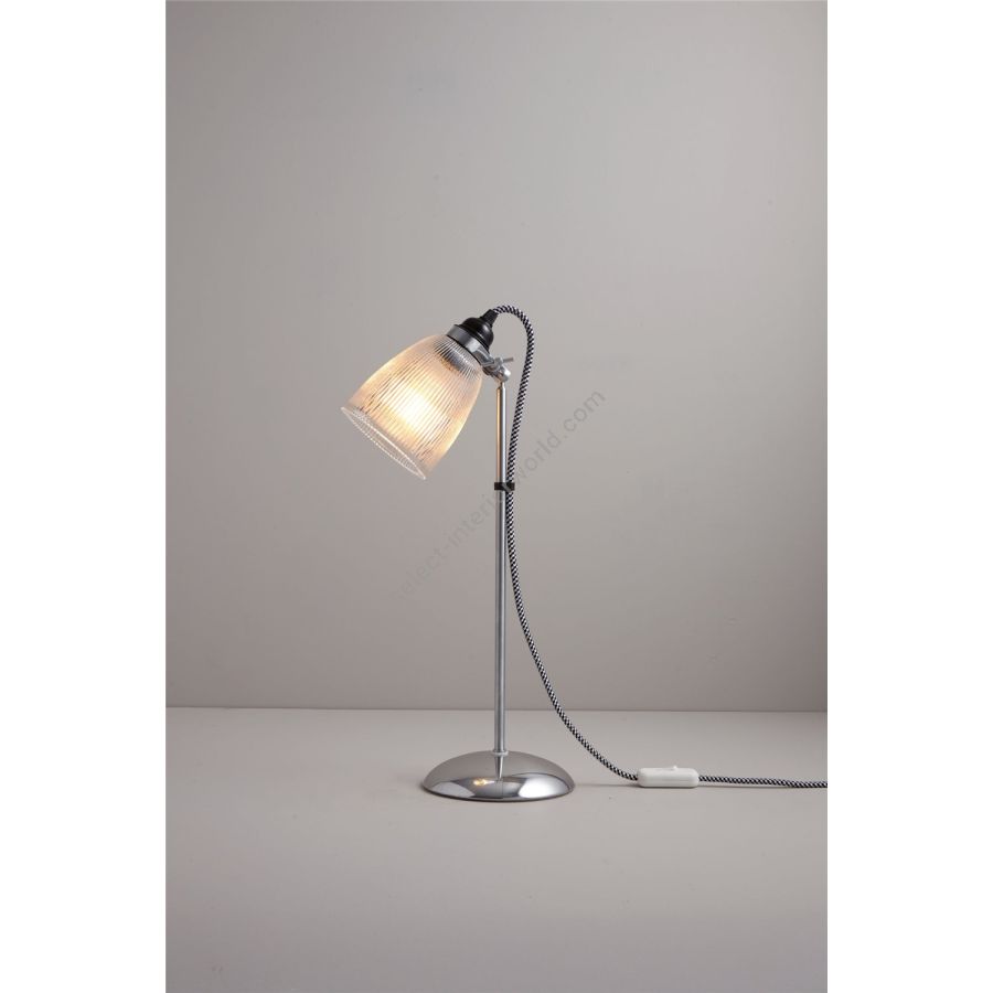 Our Primo Table Light features a unique black & white cotton braided cable, sleek chrome arm and base, and an intricate glass prismatic shade that gently diffuses light. Also available as a floor light.