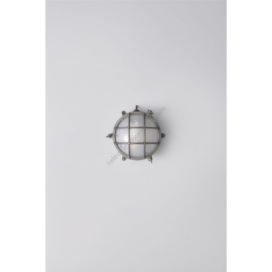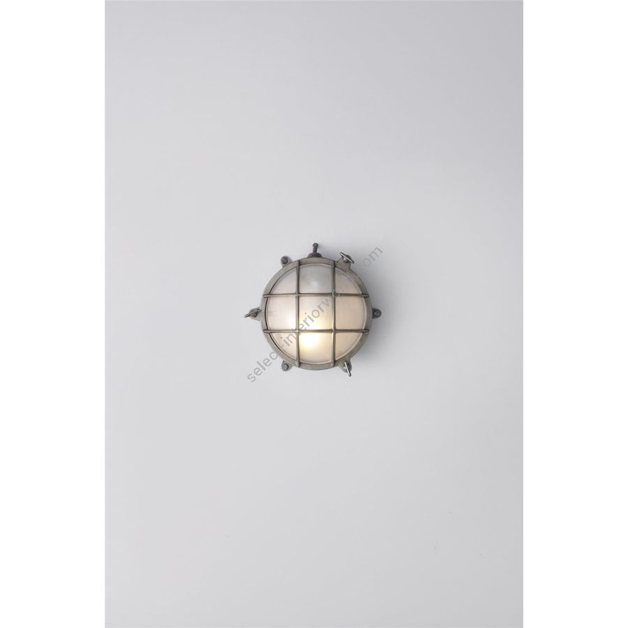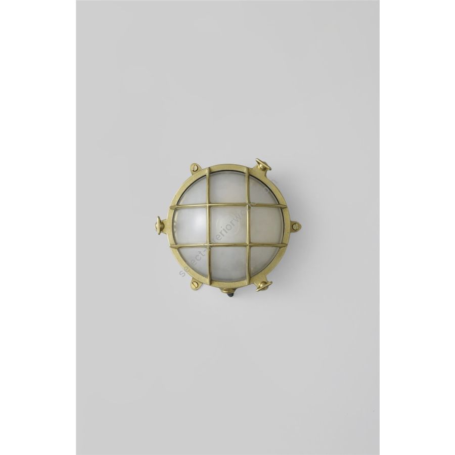 A classic Davey Lighting die-cast bulkhead in natural brass (unlacquered) with frosted glass diffuser. This fixture is also available in a weathered brass and chrome plated finish, and a larger size (DP7029). Front guards secured by three wing nuts. Glanded surface cable entry.