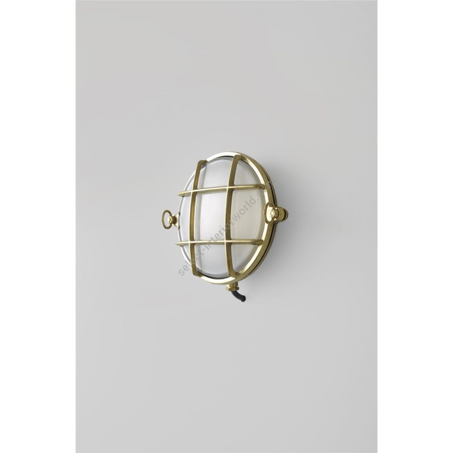 A small die-cast bulkhead light in natural brass (unlacquered) and with frosted glass diffuser. Also available in weathered brass and a chrome plated finish. Front guard secured by two wing nuts, dome nuts optional by request. Glanded surface cable entry.