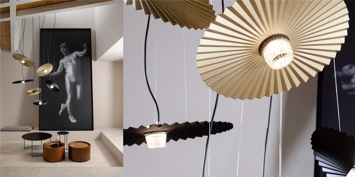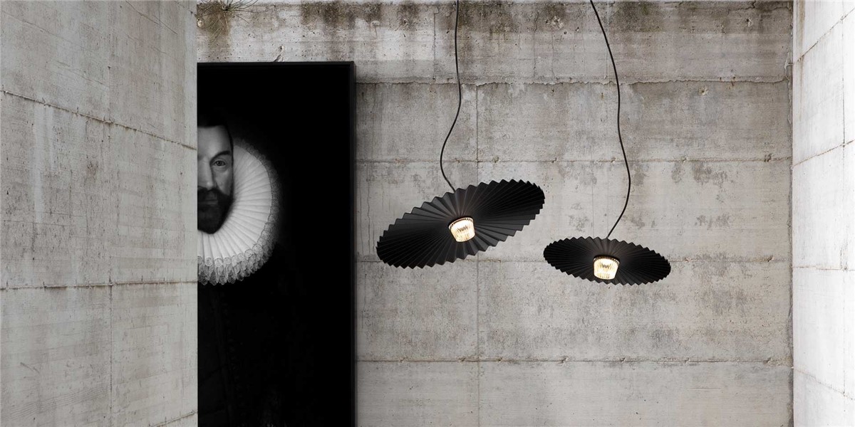 Inspired by the “motif” of ruff collars, the Gonzaga suspension consists of a lampshade in matt aluminum, white or black or with a brass finish, with a particular pleated finish that surrounds a blown glass diffuser.