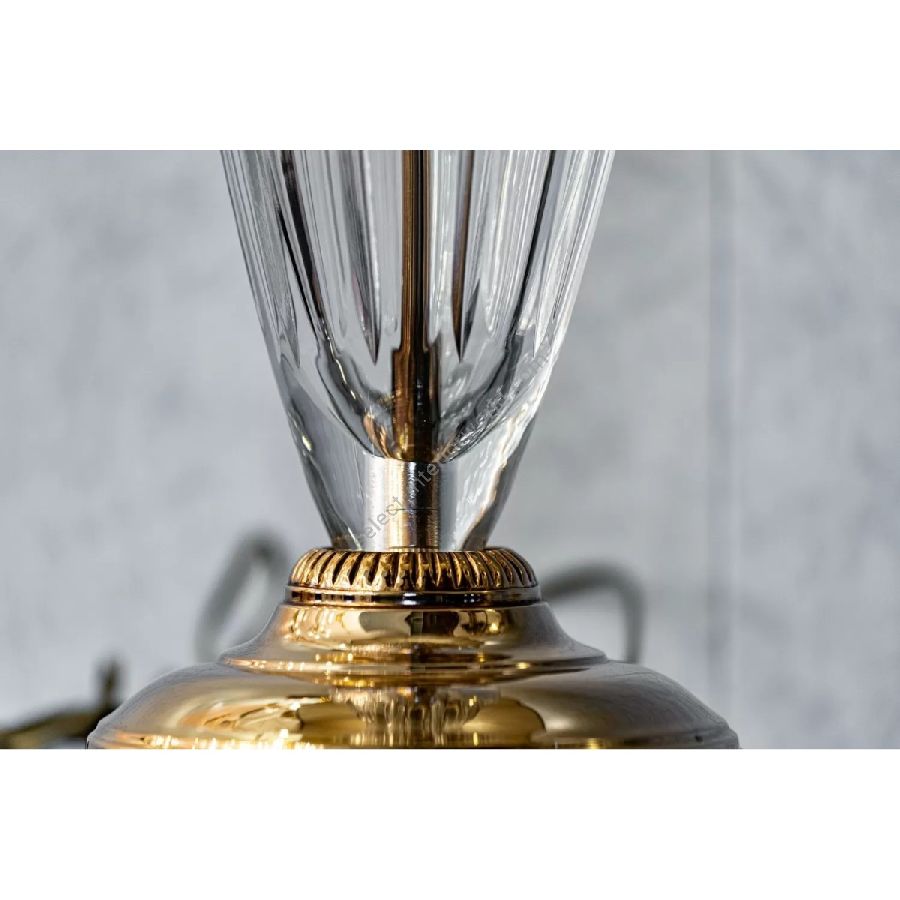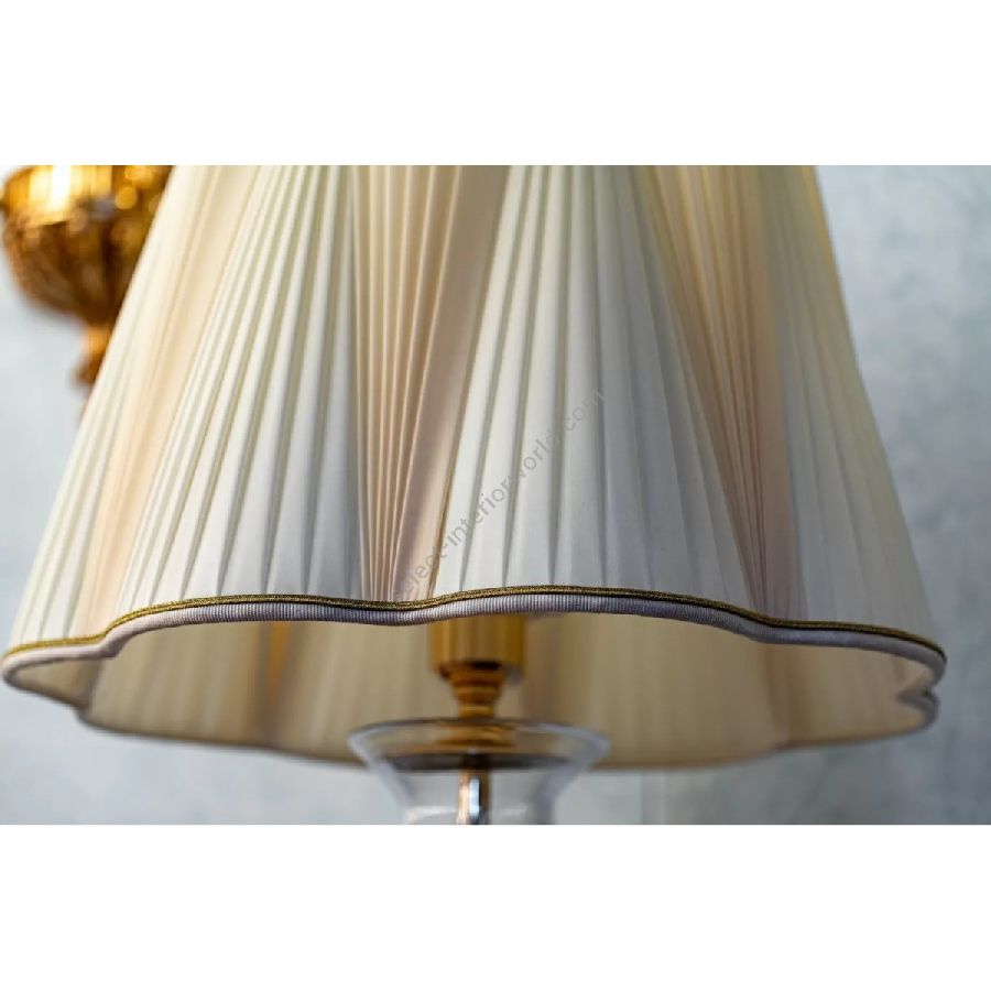 Table lamp with column in transparent crystal decorated with a metal band with floral motif with ivory pleated silk lampshade. Available in pure gold or chrome finishes.