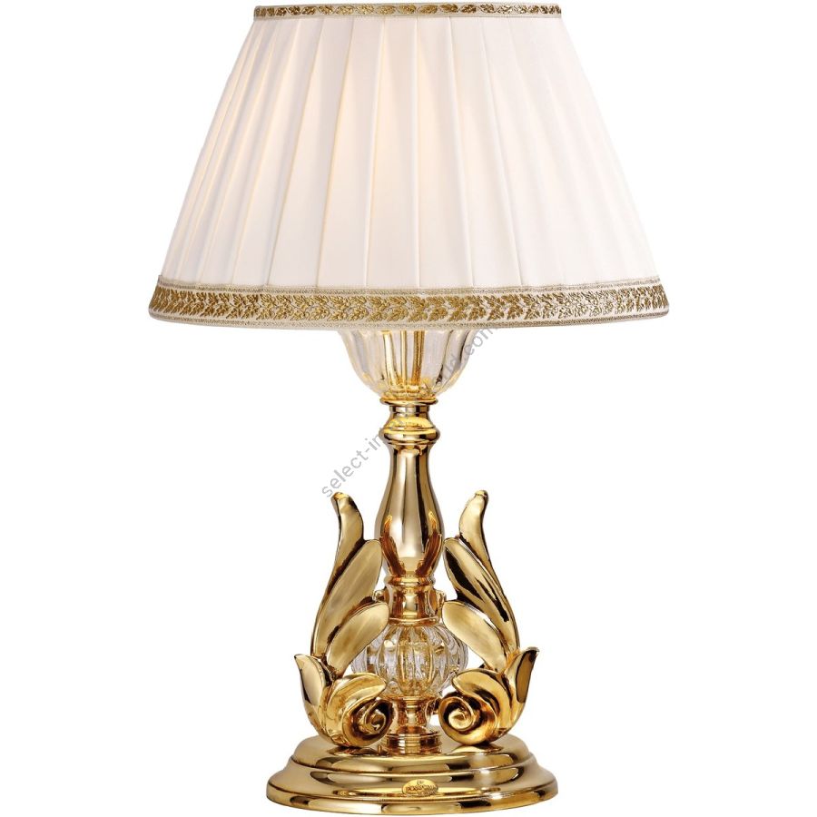 Lucilla is a very decorative and important collection. All models are in brass available in two different finishes, satin and shaded pure gold. The metal part is very worked and embellished with details in transparent and gold crystal and large ivory-colored silk lampshades. Applique and table lamps in different sizes complete the collection.
