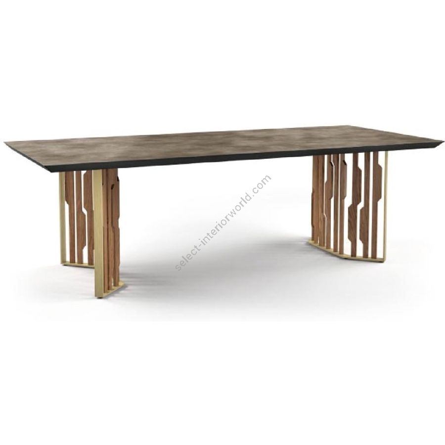 Table with metal painted base and decorative strips in black walnut solid wood. Top available in marble or MDF coated poplar plywood with lacquered finish.