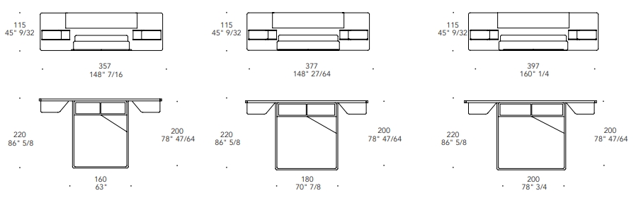 Bed with a wooden frame and upholstered headboard and bed frame covered in fabric or leather. Suspended bedside tables with doors matching the upholstered headboard and Bronze mirror tops. Polished steel details. Mattress not included.