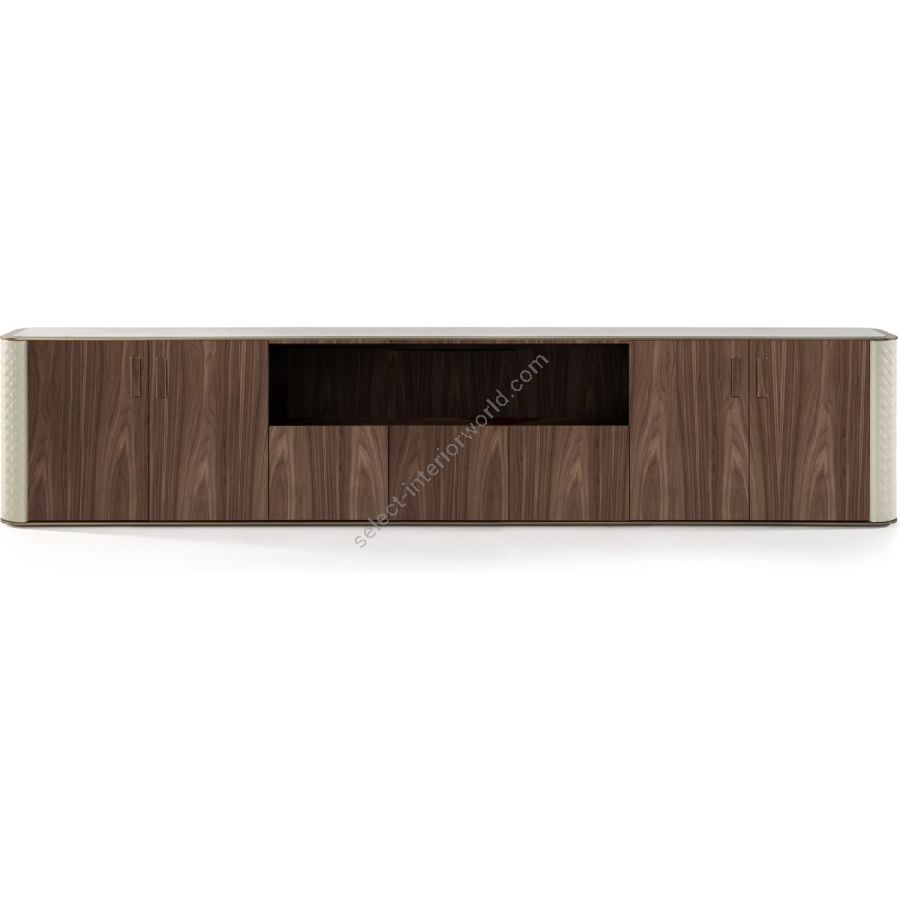 Buffet with wooden structure. Doors with push-pull opening. Sides covered with leather. Top in Marble glass with profile in satin brass finish. Intnal shelves in glass. 2 doors, 1 flap, 1 open space Sides in leather CAT.C, NABUK or COLORATA with quilting* Noce Canaletto, Canaletto Hennè, Rovere Beluga or shiny lacquered.