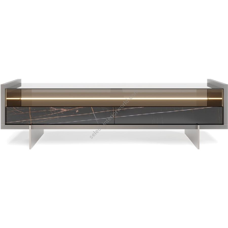 Metal legs in Bronze, brass, dark brass, titanium finish. Doors and drawers in MarmoReflex, LegnoReflex, Mesh or Carbonio glass. Models B and C with a case in bronze or smoked glass with LED lighting.
