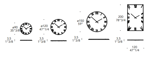 Round or rectangular mirror/clock in extraclear mirror glass with 20 mm bevel. Also available in smoke-grey mirror or in Antique Mirror or in Marmoreflex/Legnoreflex glass. Roman numerals in smoke-grey serigraphy and hands in titanium. Optional back LED lighting.