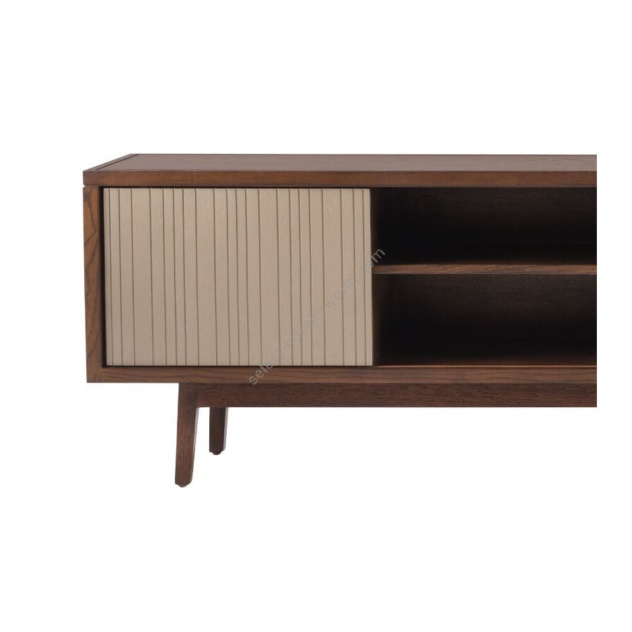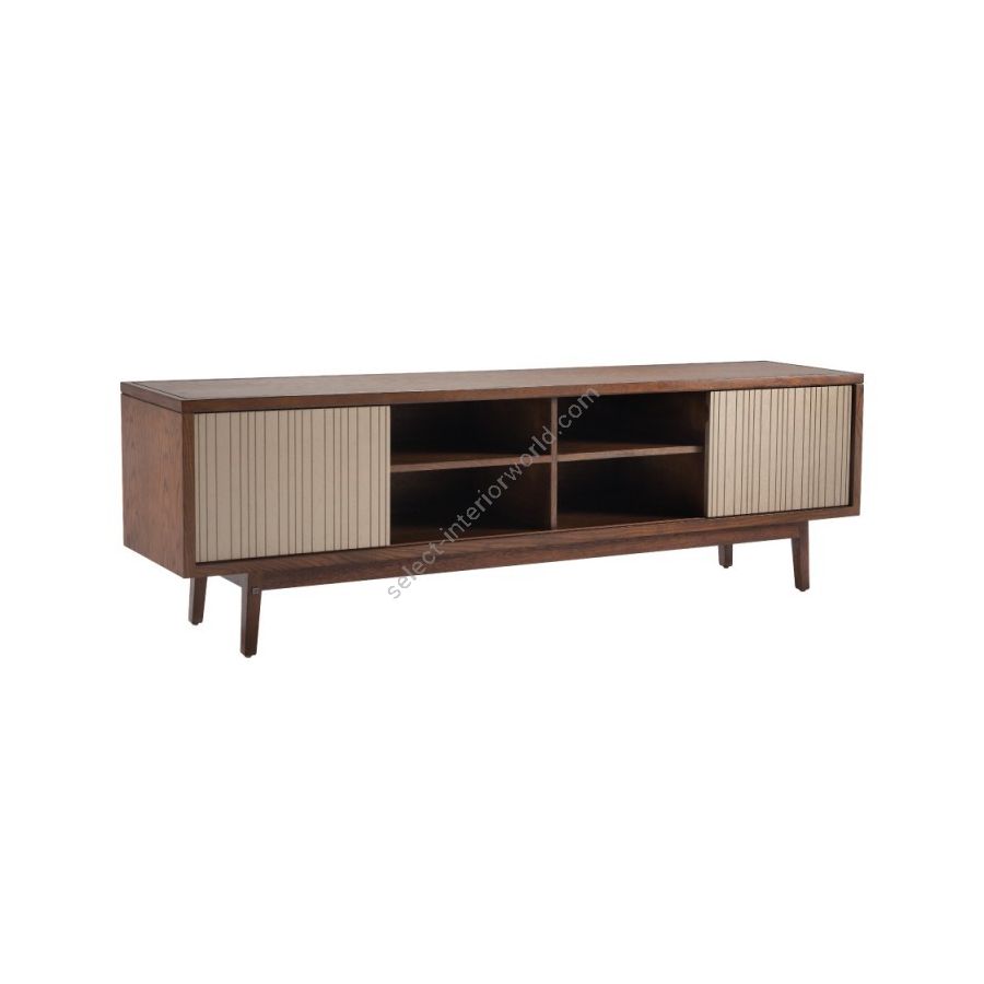 The Rumba Credenza 200 offers practical and functional entertainment with two sliding doors featuring wooden details. Its top features marked bevels, natural wood patterns and stands on tall, stylized legs that truly enhance this piece.