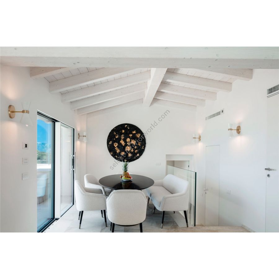 The Bernadette dining bench has a delicate imprint of the Seventies. Comfortable and relaxed in the seat, it fascinates with the refined shape of the legs, whose lacquered wood culminates in a metal tip: a seductive and confident detail like an accomplice smile. The dining armchair is part of a family that also includes a dining chair, an armchair, a barstool, a small sofa and a pouf. Due to the attention to tailor-made details and her noble personality, Bernadette embodies the DOM Edizioni philosophy at its best.