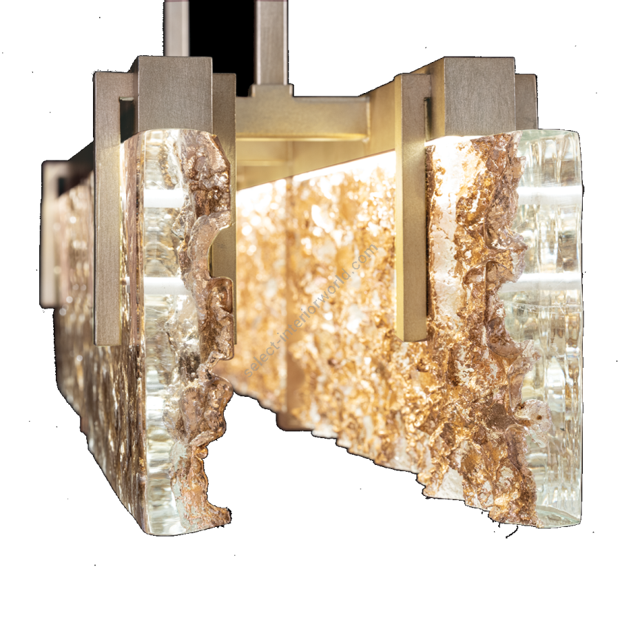 Linear LED pendant featuring highly polished parallel forms of rich textured, hand-cast crystal in a clear or Gold Leaf choice. All available in three standard finish options, Soft Gold Leaf , Silver Leaf, or Black Iron.