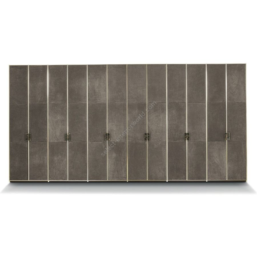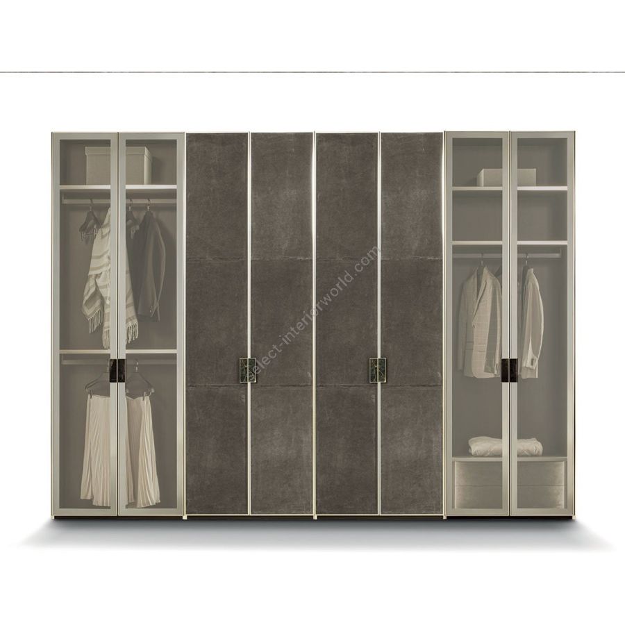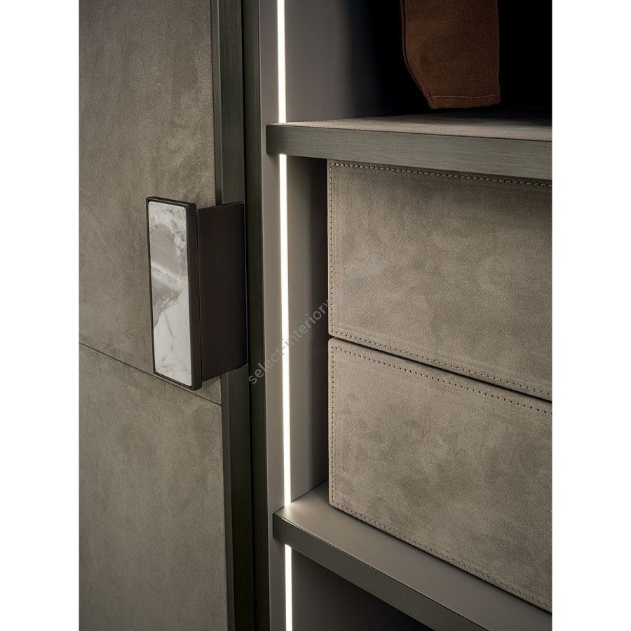 Wardrobe and walk-in closet systems with highly versatile modular design to fit into any type of space. The Atelier system proposes advanced wardrobe interior organisation featuring a broad range of accessories. Cut to measure for perfect adaptability. Blockboard structure with 25 mm MDF veneer in the wood finishes: Dark matt tinted Zebrano, matt Canaletto walnut. Front edges of modules and door profiles feature anodized aluminium finishes, as follows:- Matt Platinum- Matt satin bronze- Bright Aluminium- Bright Gold- Bright Champagne Gold- Bright dark brown electrocolour. The shelves are in dark matt tinted Zebrano wood, matt Canaletto walnut, covered in P.3 Cat. Suede or Tecsuede, or in natural, bronzed, or smoky 8 mm glass. The wood or covered shelves also come in a pull-out version. Drawer fronts are covered in P.3 Cat. Suede or Tecsuede leather. Drawer bottoms can be in wood or lined in P.3 Cat. Suede or Tecsuede leather. The side panels have LED lighting over their entire height. The back panel’s internal side can be matt lacquered ivory colour. The system includes a special 130 cm panel, which can be custom-designed into make-up corner, writing desk or TV compartment with bronze or smoky glass dividers in the shelf space. NOTE_the side panel includes an adjustable foot.