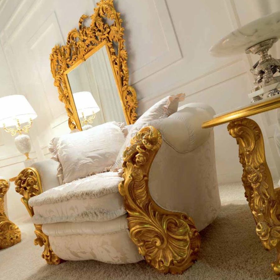 Elegant upholstered armchair with damask covering. The RENOIR sofa is embellished with remarkable carvings finished with gold with ivory patina, it is finished with fine materials based on ancient artisan techniques handed down over the years from generation to generation.