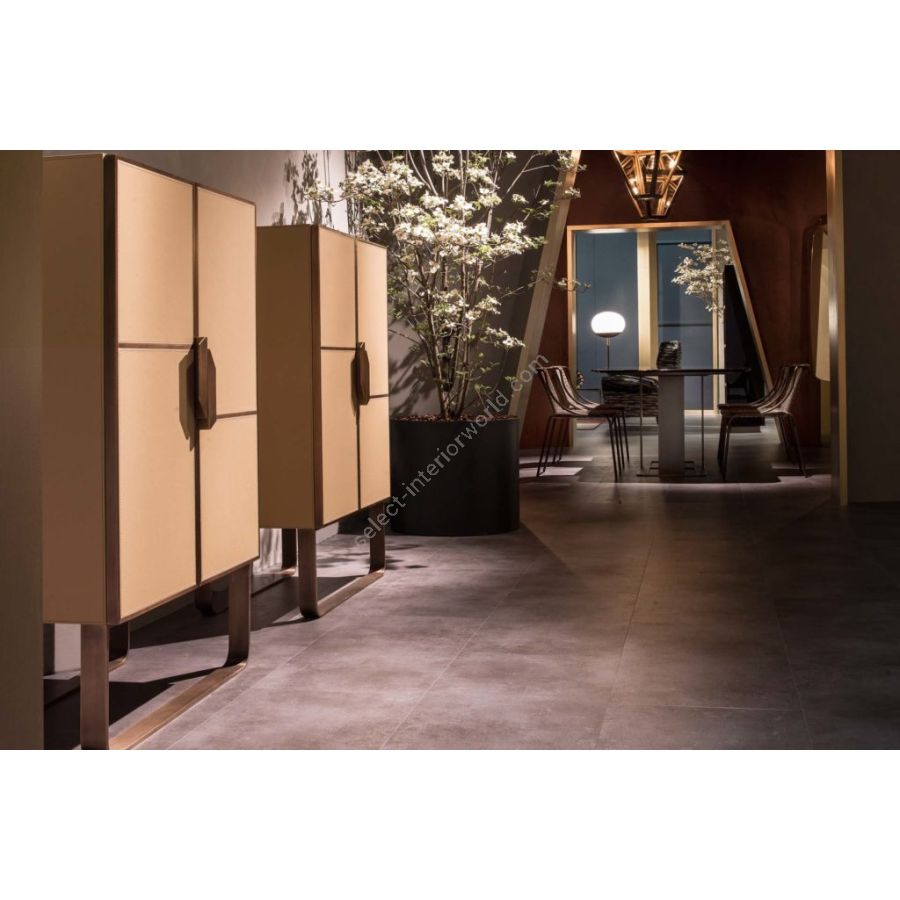 TWIN is a charming modern sideboard with leather-covered doors, brass structure and bronze finish. Its interior is embellished with a mirrored background and lighting system. The interior of TWIN consists of two drawers, shelf and glass holder.