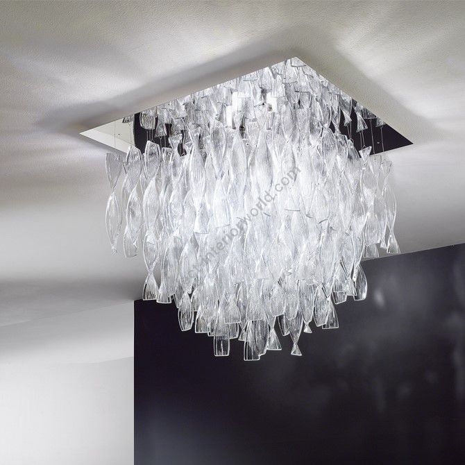 Masterful glass craftsmanship shines through in finely crafted pieces, meticulously assembled to create a fluid play of light and reflection. Blending tradition and design, each element exudes unique charm. Featuring suspensions, wall, and ceiling lamps, the Aura collection brings refined, timeless elegance to any space, where light takes center stage.