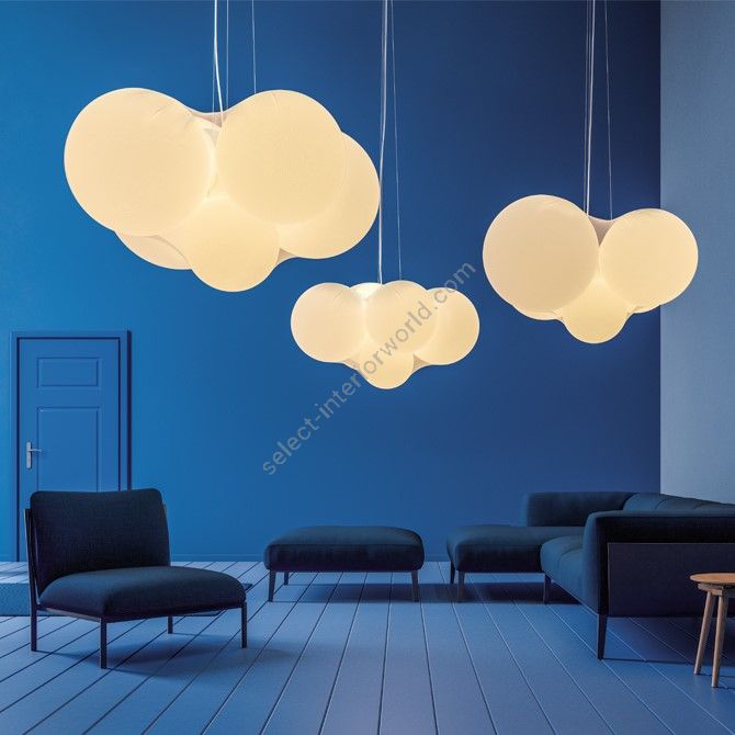 Cloudy bridges design and art, creating a striking light sculpture. Five asymmetrically arranged spheres, wrapped in semi-transparent fabric, evoke the softness of a floating cloud. More than a pendant lamp, it harmonizes form and diffused light, becoming a dynamic, poetic focal point in any space.