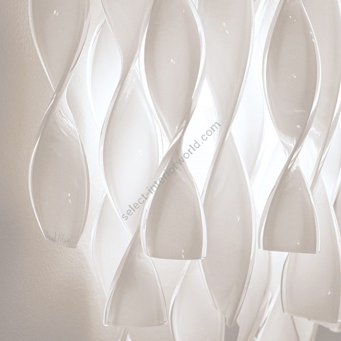 Masterful glass craftsmanship shines through in finely crafted pieces, meticulously assembled to create a fluid play of light and reflection. Blending tradition and design, each element exudes unique charm. Featuring suspensions, wall, and ceiling lamps, the Aura collection brings refined, timeless elegance to any space, where light takes center stage.
