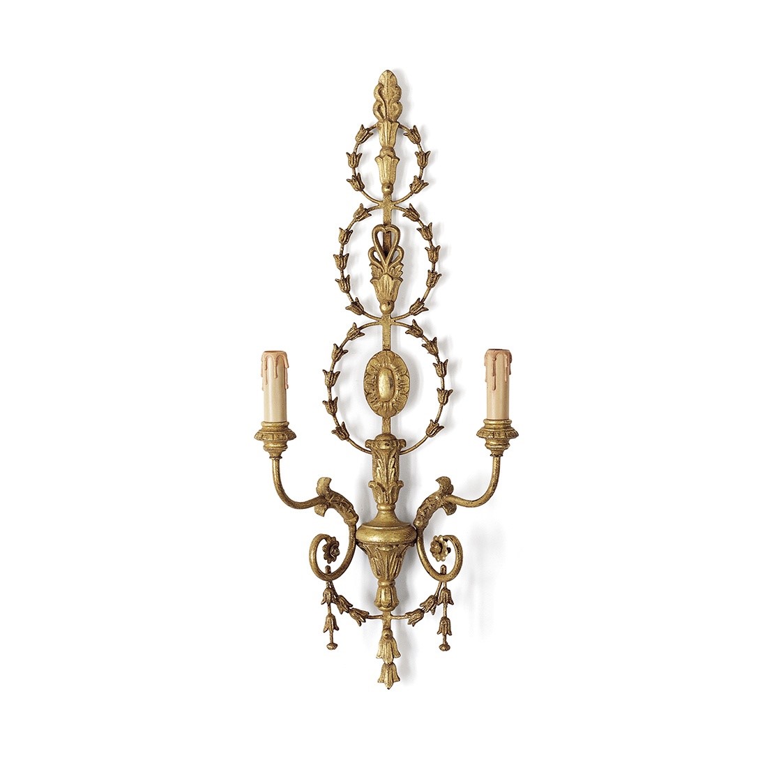 The Adam design has a giltwood and metal neo-classical style. A very elegant 2 branch wall light, with delicate scrolls embellished with acanthus leaves. Our lights are made by skilled artisans. The unique range of highly decorative lights is created by hand using traditional materials, carved wood, wrought iron, and gilding with subtle patination.