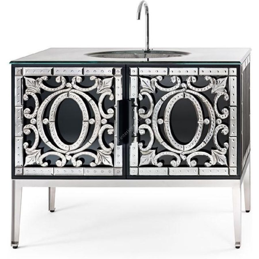 Molten hand basin top made of medium antique mirrored glass. Doors made of bevelled and engraved glass with medium antique mirrored finish.