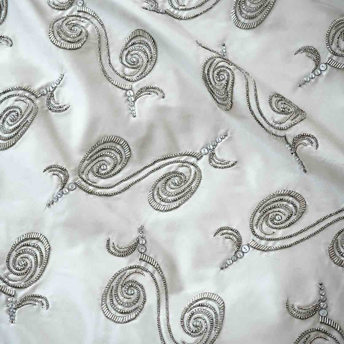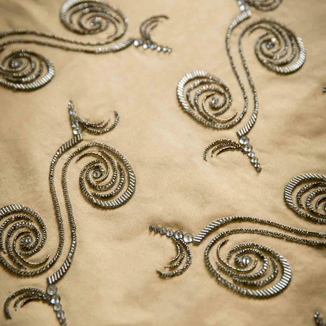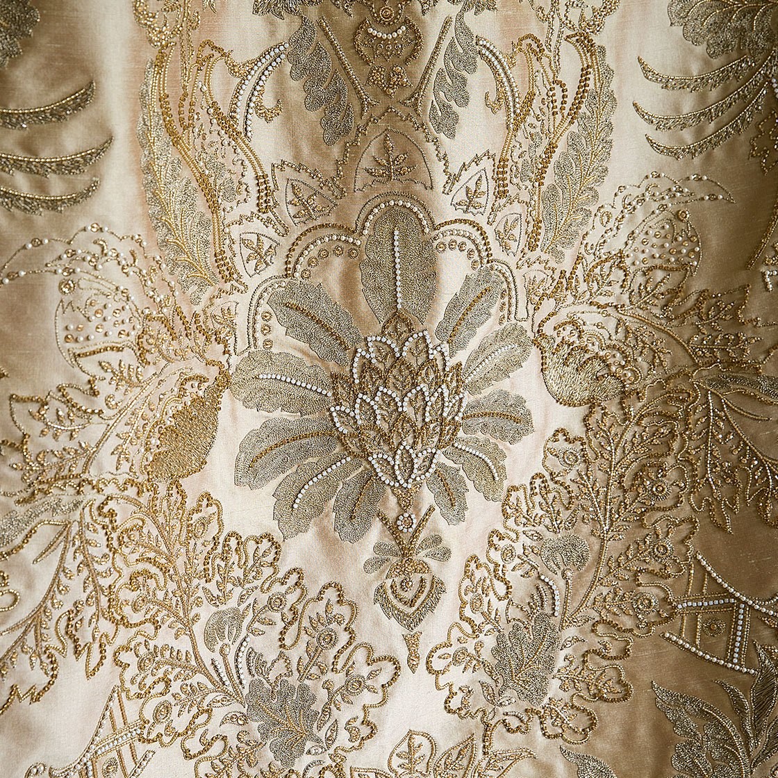Our Couture fabrics are bespoke and hand embroidered to order. They can be created in fine gold or silver silk thread and embellished with freshwater pearls and semi-precious stones. Each pattern can be coloured and designed to fit your needs. We can embroider onto any background fabric including: silk, velvet, organza and leather