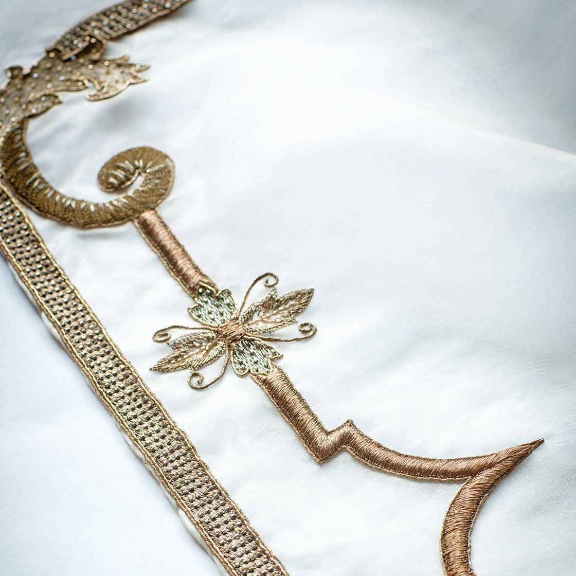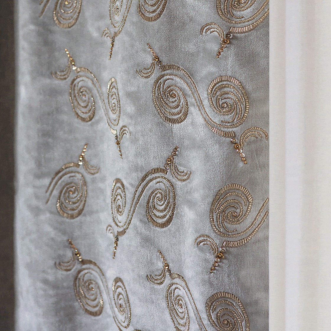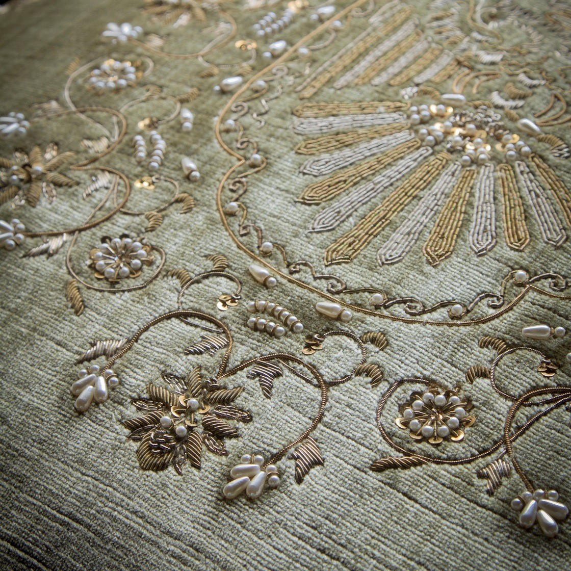 Our Couture fabrics are bespoke and hand embroidered to order. They can be created in fine gold or silver silk thread and embellished with freshwater pearls and semi-precious stones. Each pattern can be coloured and designed to fit your needs. We can embroider onto any background fabric including: silk, velvet, organza and leather