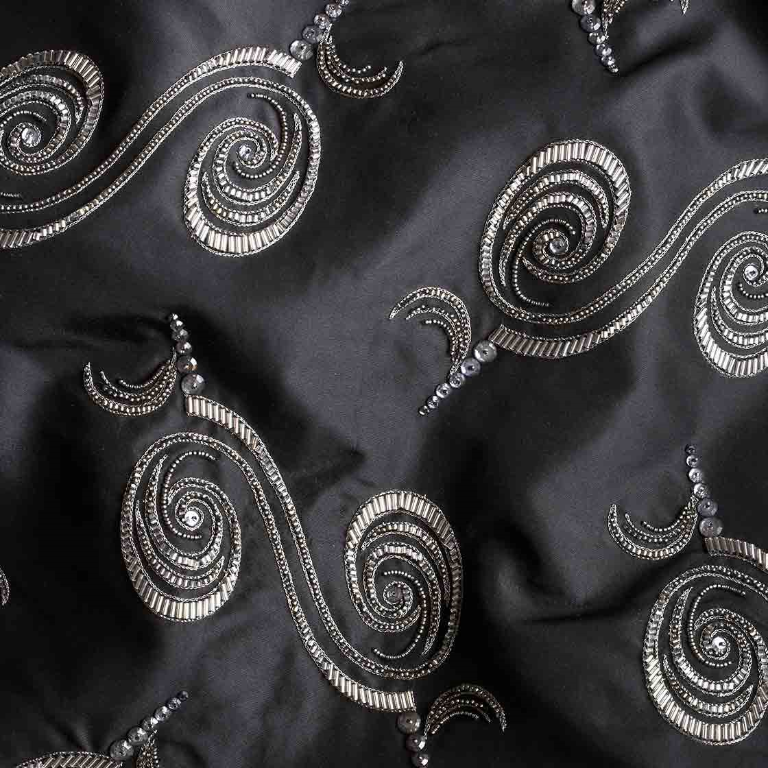 Zarbo is a dynamic Art Deco inspired design featuring an array of elegant spirals. The fine hand sewn beadwork results in a strong contemporary look and a striking visual allure.