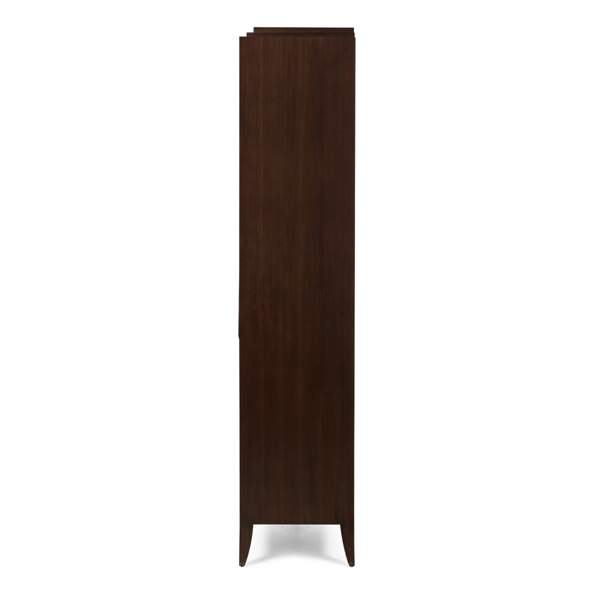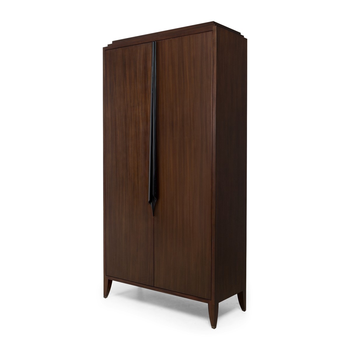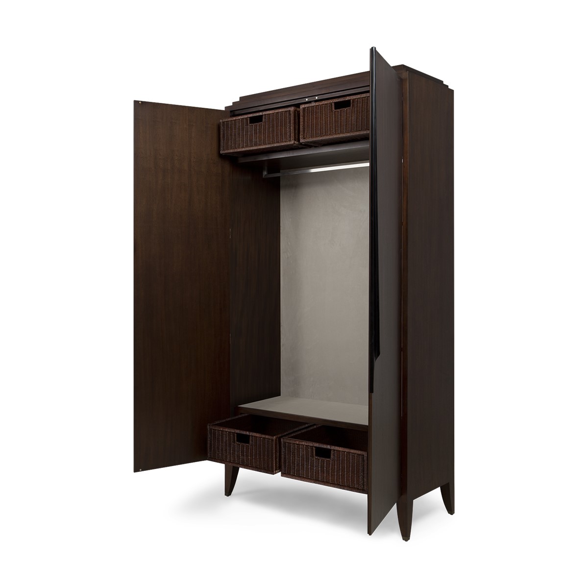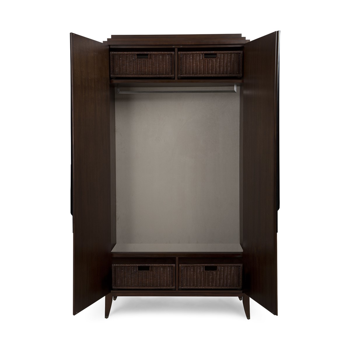 This sleek wardrobe features a hanging rail, two upper and lower storage drawers. The elongated carved handles, stepped top and metal finish tipped legs bring refined embellishment to a beautifully understated piece.