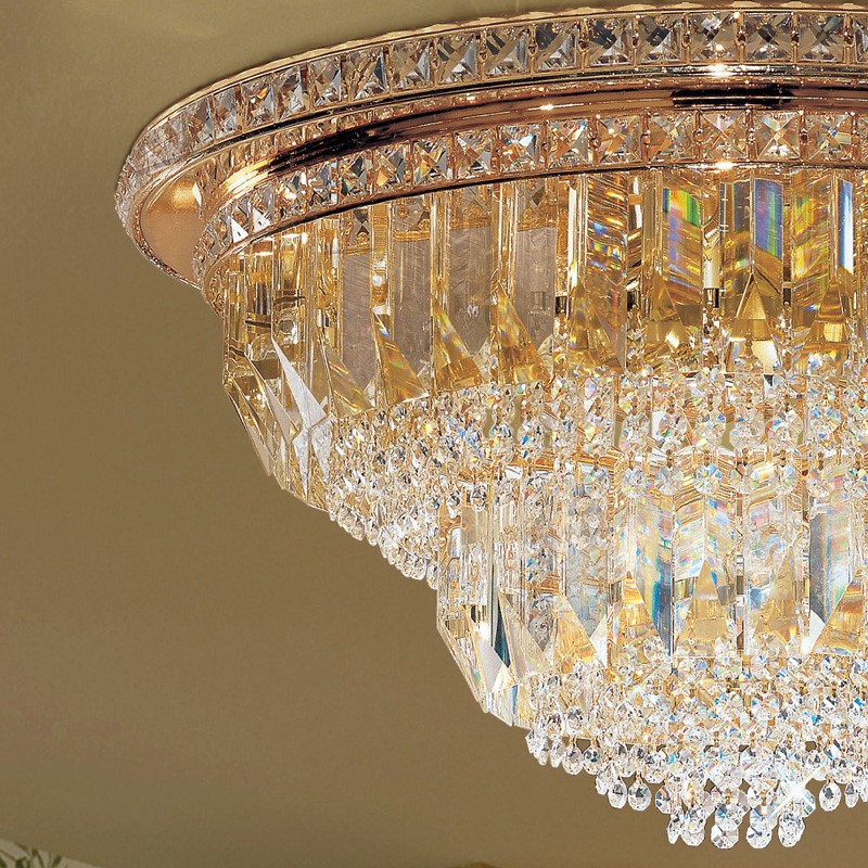 Ceiling lamp with crystal trihedrals or trihedrals and quadrihedrals in murano glass, available in many colours and a frame in 24 karat polished gold or chrome.