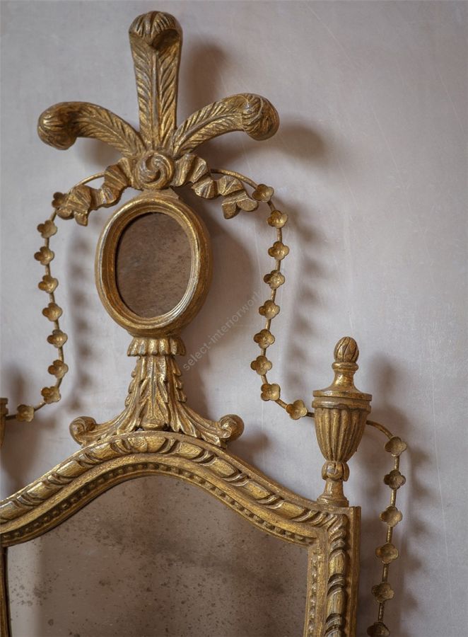 A delicately carved Regency style small mirror, the Catherine features typical neo-classical carved foliage, Roman urns and pendant husks, surmounted by the Prince Regent’s crest.